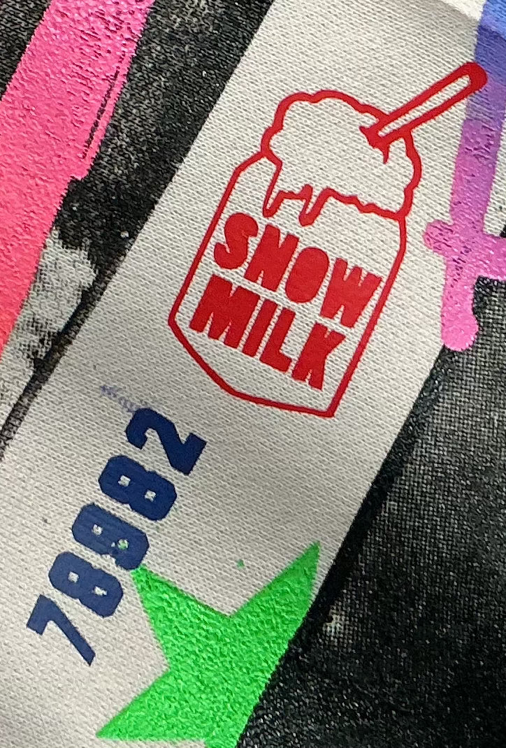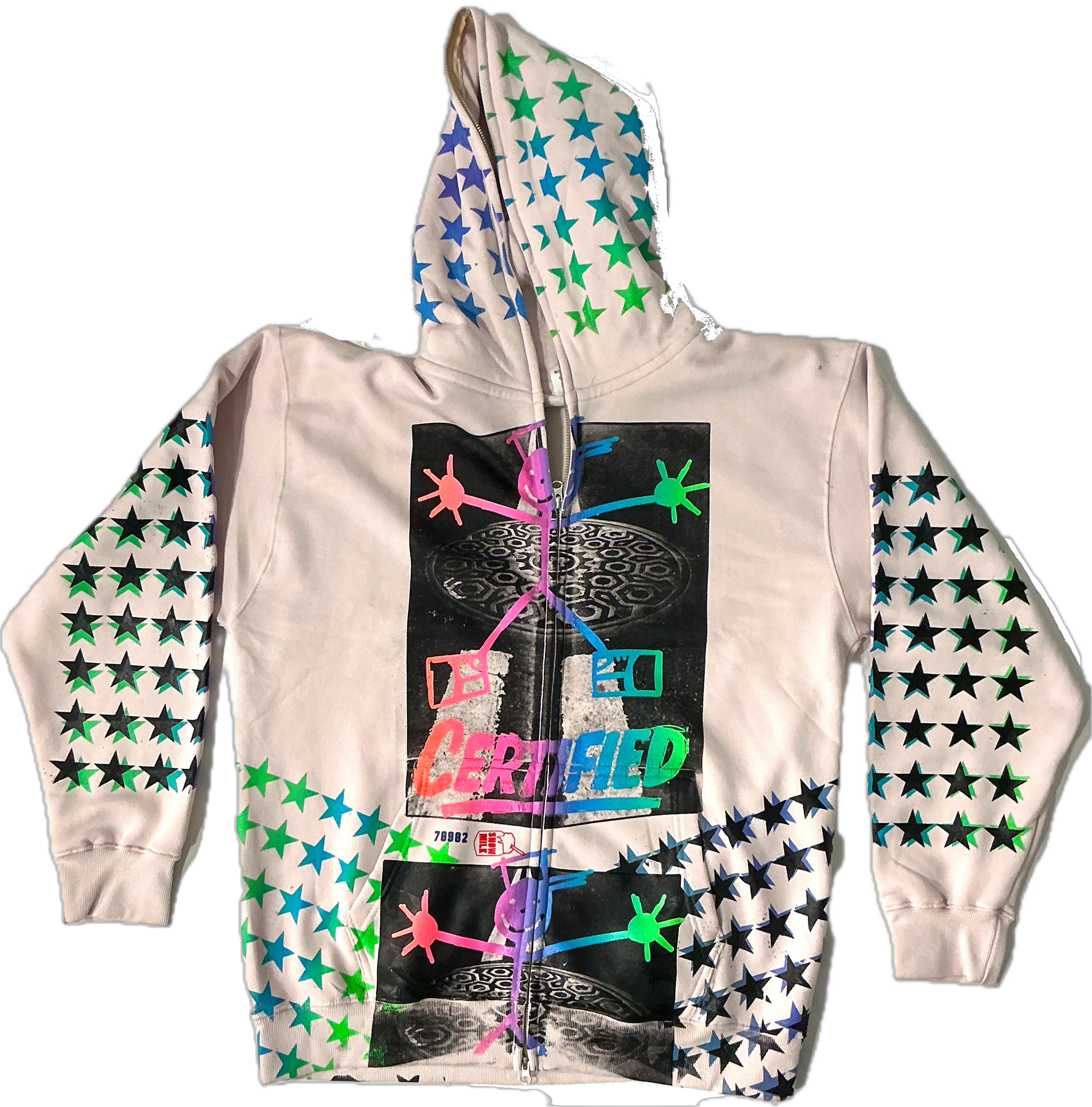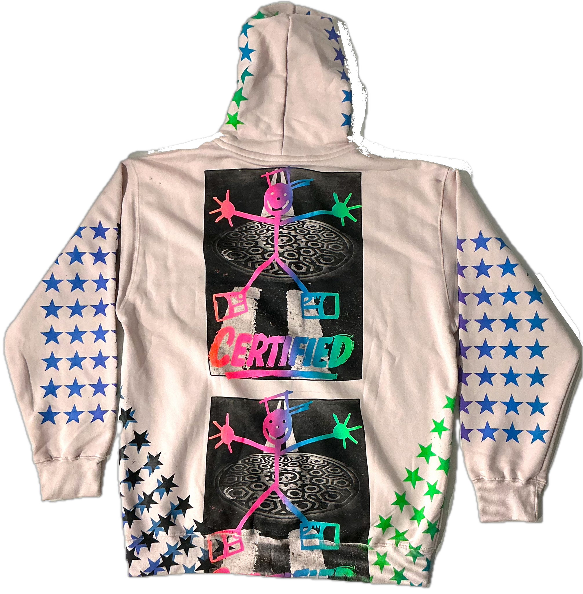This is a one of a kind piece of clothing that has a picture of a street, stars, a stick man and Certified written all over the garment.