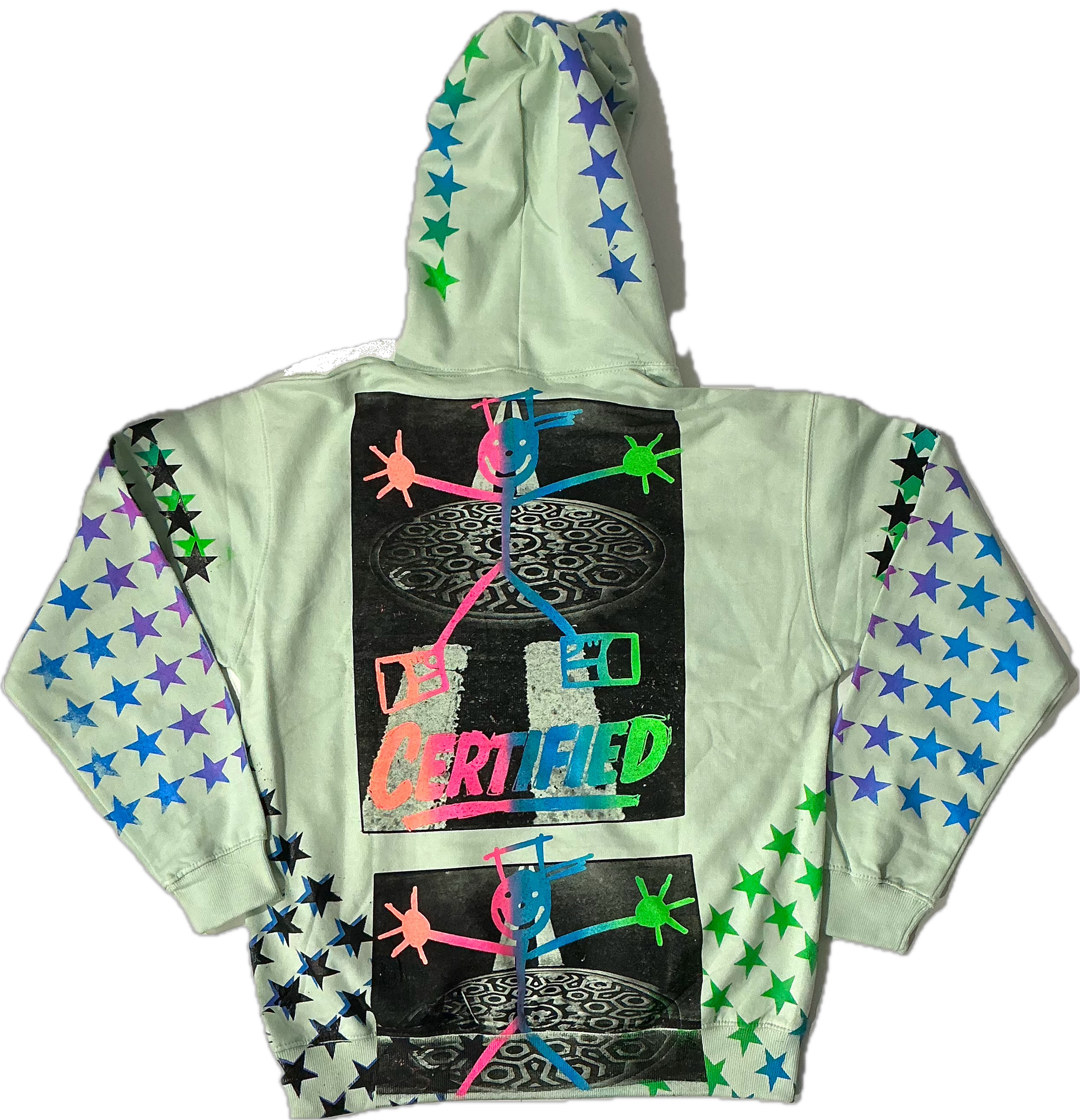 This is a one of a kind piece of clothing that has a picture of a street, stars, a stick man and Certified written all over the garment.