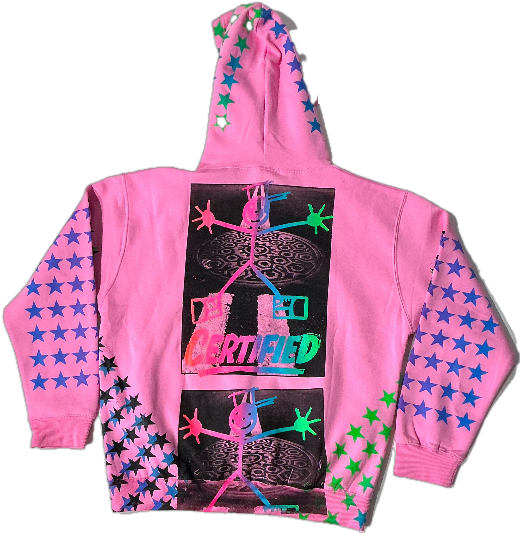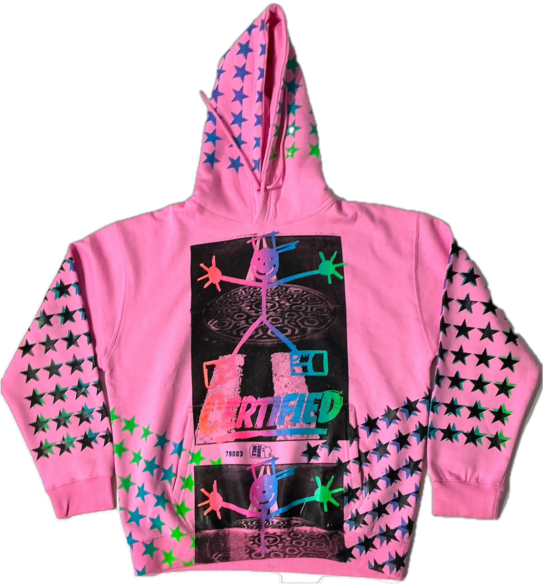 This is a one of a kind piece of clothing that has a picture of a street, stars, a stick man and Certified written all over the garment.