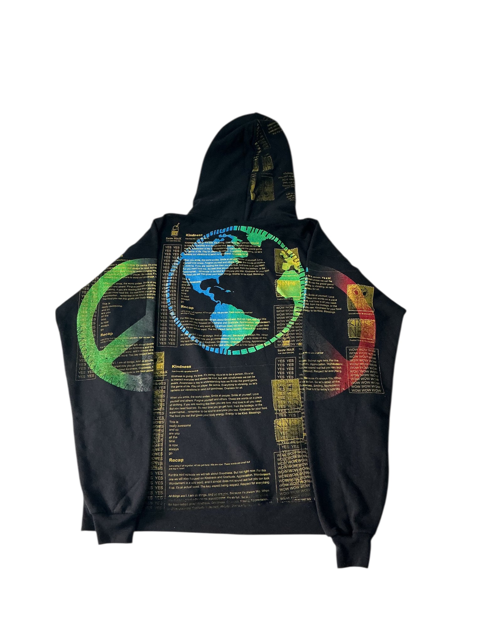 This is a one of a kind piece of clothing has peace signs, world peace and a special drawing printed all over.
